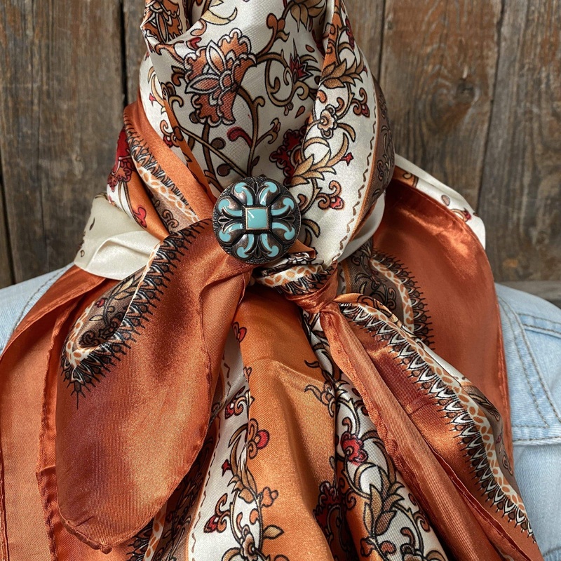 Our classic wild rag / scarf in Burnt Orange, Brown & White (WR2179) with 1.25" Copper Turquoise Western Concho Slide. It is a square and measures 35" x 35".A perfect look for any rodeo event or a night out on the town. Can be just knotted or complimented