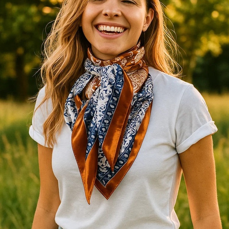 Our classic wild rag/scarf trimmed in rust and navy with a two-toned paisley pattern. A perfect square - measuring 35"x35". Adding that extra touch of a western style to your outfit.100% soft silky feeling polyester is durable to keep you warm in the cold