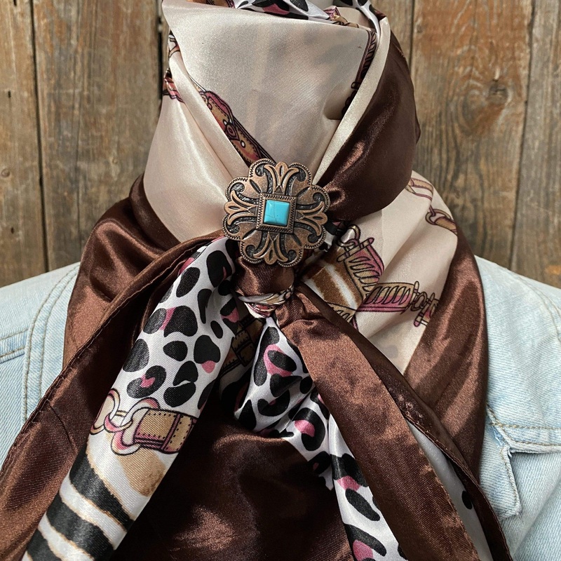 Our Multi-Animal Print wild rag / scarf(WR2295) in Tan with 1.5″ Copper Turquoise Western Concho Slide.