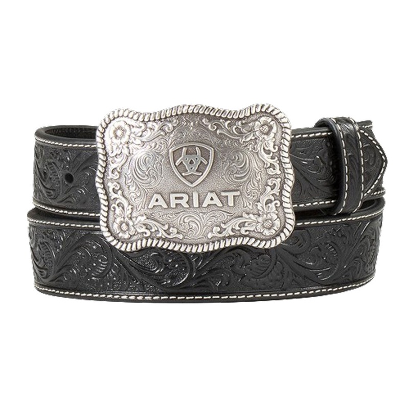 Ariat Men's Straight Floral Embossed Black BeltAriat Mens BeltWidth: 1-1/2Genuine LeatherFloral Embossed BodyAriat Name and Logo Antique Silver BuckleBlack