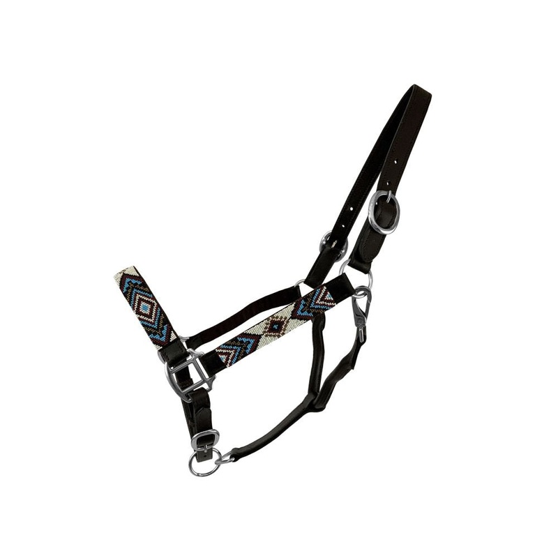 This dark brown leather halter is perfect for riders who want to add a touch of style to their tack collection. The halter is crafted from high-quality leather, which is both durable and comfortable for your horse. The rich, dark brown leather is complemented by the intricate Aztec print beaded overlay, which adds a touch of elegance and sophistication to the overall design.
