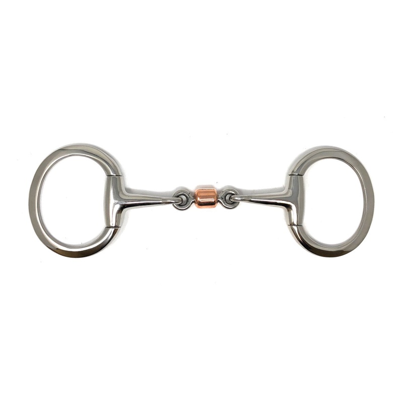The AJ Tack 3-Piece Copper Roller Eggbutt Snaffle Bit is designed to provide a gentle introduction for young horses and a comfortable experience for seasoned ones. With a 5" three-piece snaffle mouthpiece featuring a copper roller, this bit promotes saliva