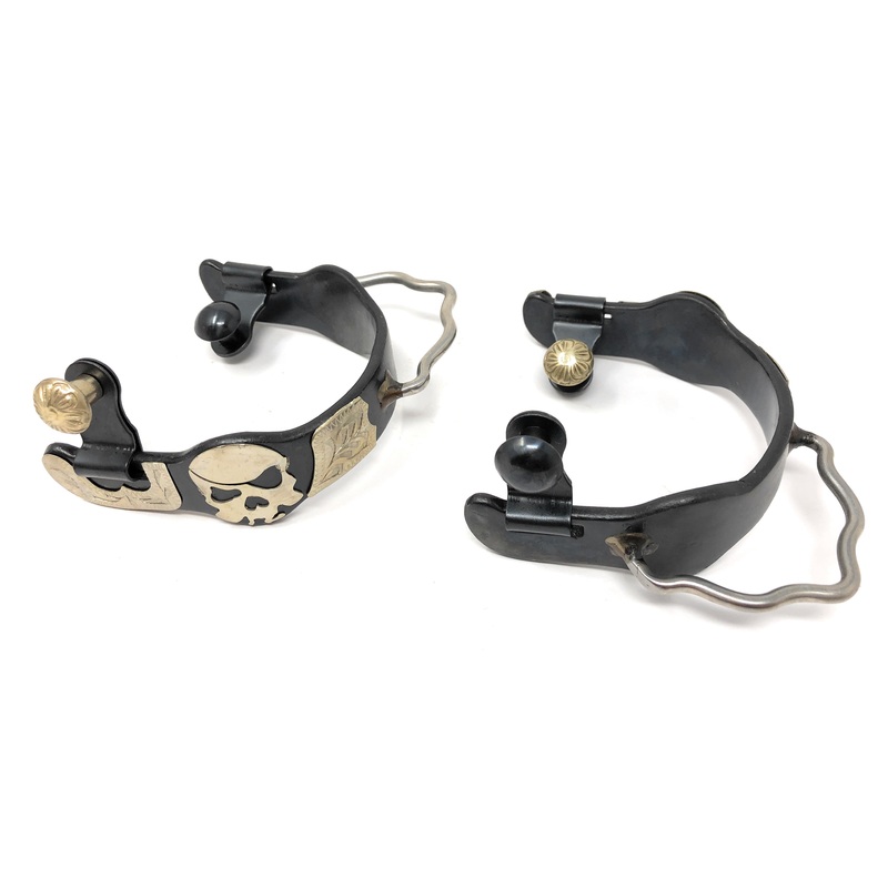 The AJ Tack Ladies Antique Brown Pirate Skull Bumper Spurs feature a unique black steel construction with a silver pirate skull motif and a hand-engraved silver overlay. These spurs also feature delicate flower engravings on the buttons, combining style wi