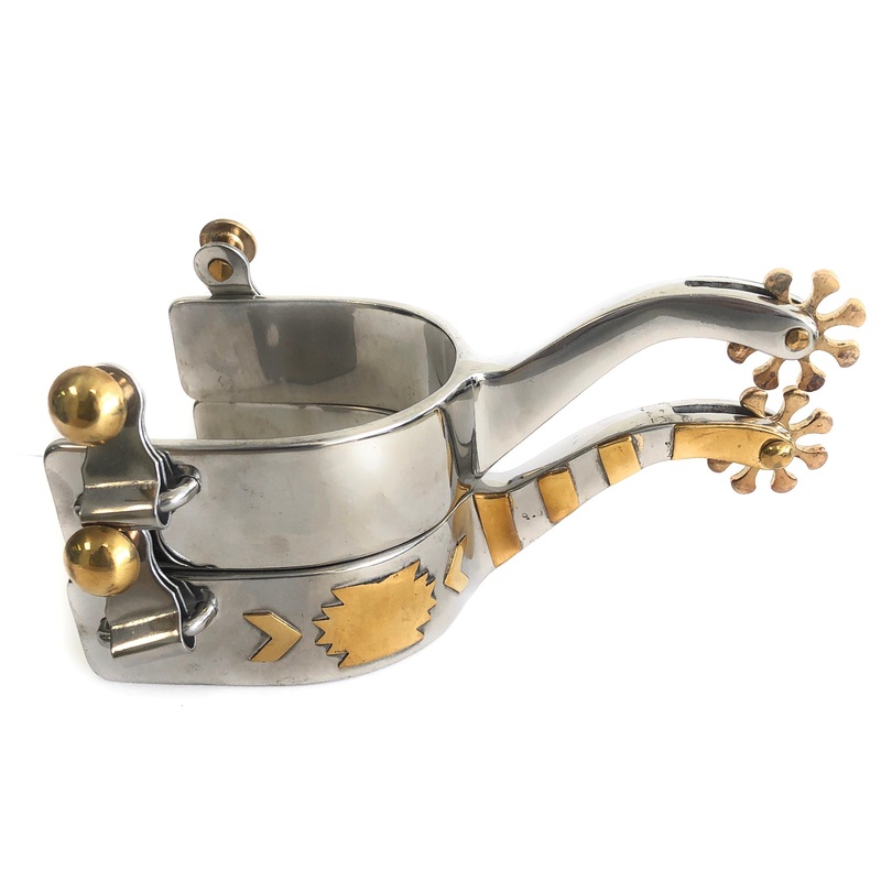 AJ Tack Men's Stainless Steel Offset Southwest Spurs are expertly crafted for both function and style. Featuring a brass southwestern and arrows motif, these spurs offer a distinctive look that embodies western heritage. The brass bars on the shank, along