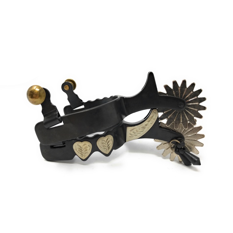 The AJ Tack Youth Antique Brown Hearts Spurs are the perfect addition to any young riders show gear. Featuring a black steel band with hand-engraved silver hearts overlay, these spurs are not only stylish but functional. With a 2 12" opening and deep shank