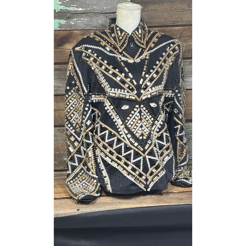 ROYAL HIGHNESS Showmanship Jacket with Black, Silver and Gold Sequence appliques Black fabric has a stretch for comfortable fit and riding Moisture wicking and Breathable fabric Stones are hand sewn and glued Full front heavy duty YKK zipper Dry Clean only