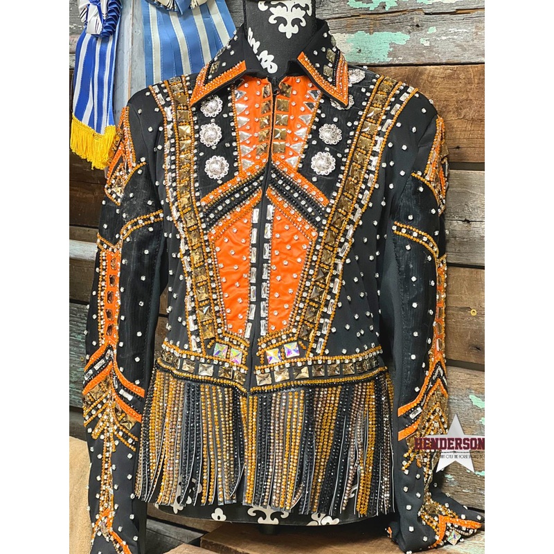 ROYAL HIGHNESS Showmanship Jacket with Orange, Rust and Gold Sequence appliques Black fabric has a stretch for comfortable fit and riding Moisture wicking and Breathable fabric Stones are hand sewn and glued Full front heavy duty YKK zipper Dry Clean onlyW