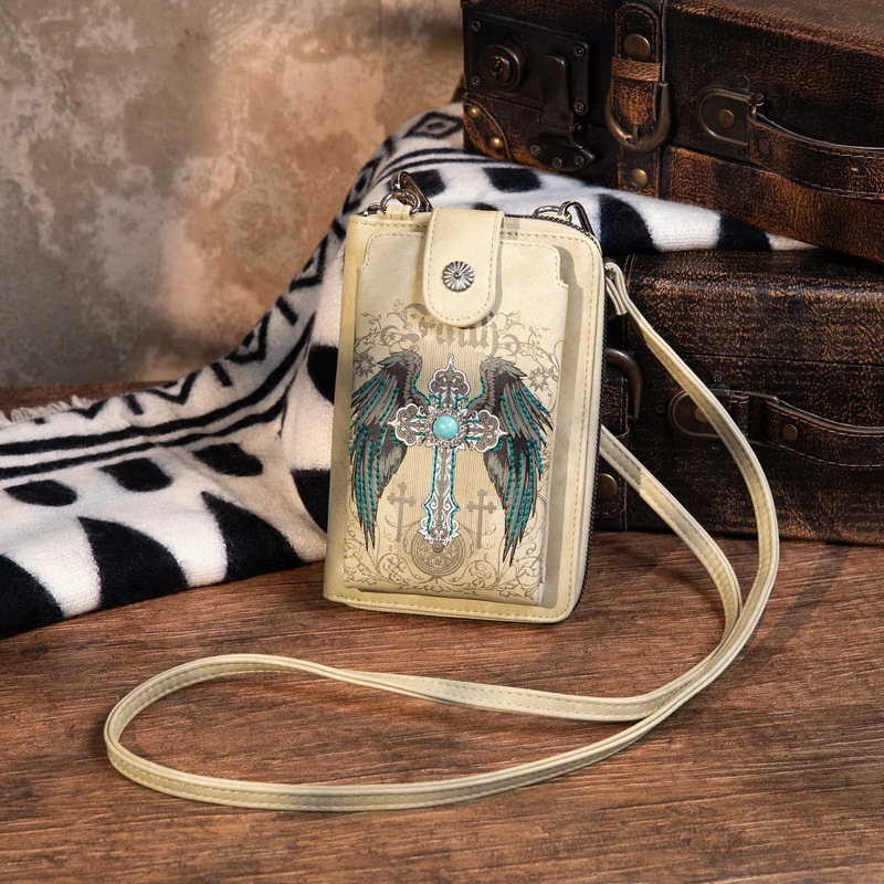 AMERICAN BLINGSFPHD-2113BGWestern design smartphone wallet . Excellent everyday wallet and perfect vacation wallet.Made of PU leather, this western Phone wallet/crossbody has:Wing Cross "FAITH" on the front pocketAntique silver concho on the flap with magn