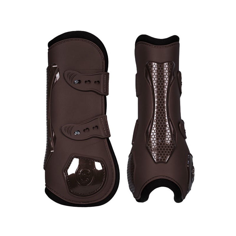 Our lightweight Anatomic Tendon Boots (FEI approved) are developed to protect horses while jumping, they help reduce impact on the front legs while simultaneously supporting the tendon. Designed in a brown color with black lining. They are manufactured wit