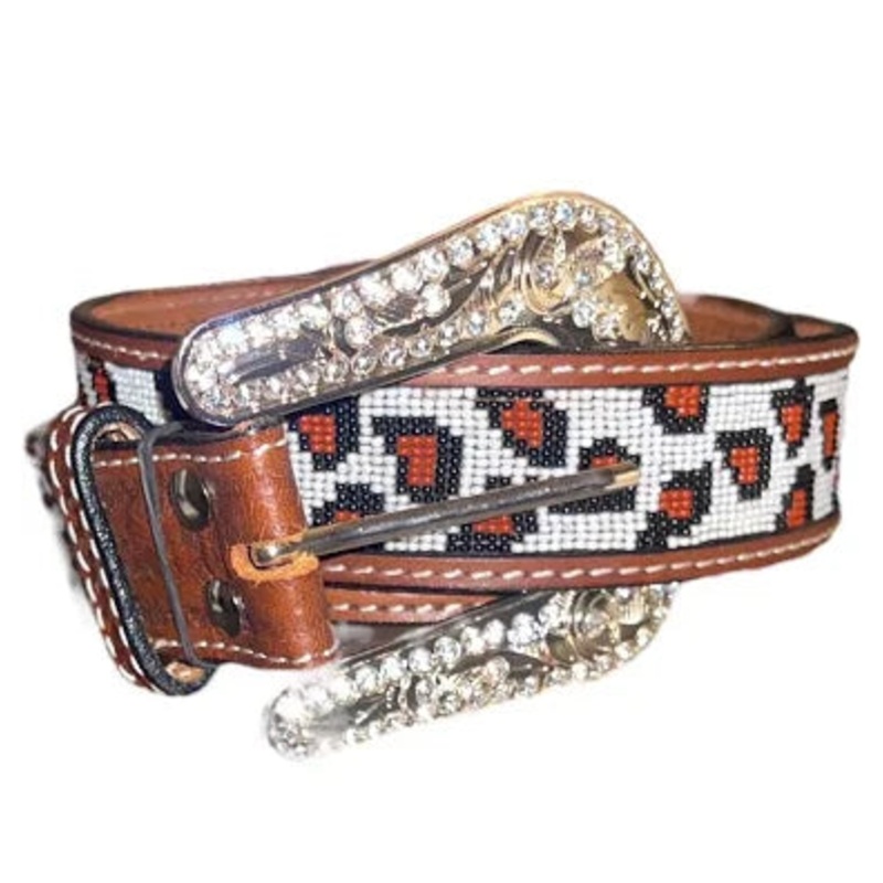 Angel Ranch Ladies belt by M&F Western Products. Striking Angel Ranch Ladies belt. Brown leather strap with pierced floral hand tooled tabs. Beaded inlay in a Leopard pattern on the strap of the belt.1 1/2"Contrast Lacing on the SidesGenuine LeatherRemovab