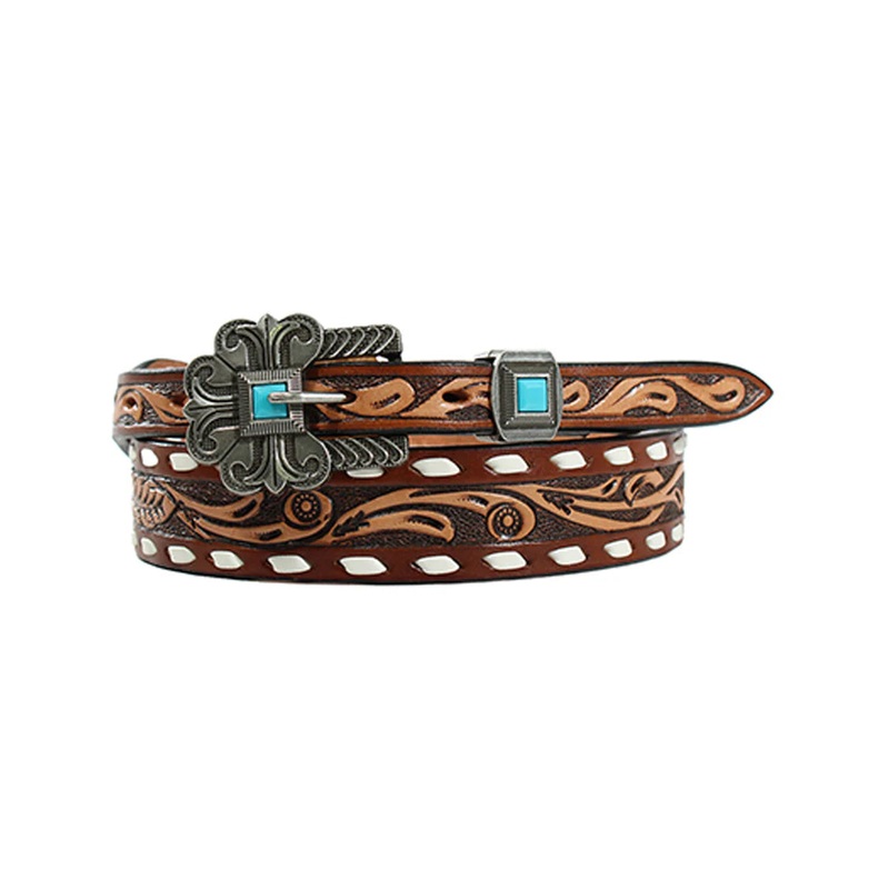 Angel Ranch Ladies belt by M&F Western Products. Tooled filagree design on the strap, and white buck lace stitching on the outer edges. Two piece buckle set with antique silver engraving and turquoise stone.