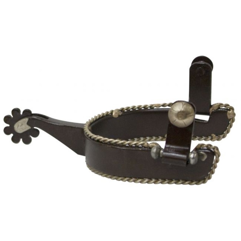Showman Men’s brown steel spur with twisted border accent. 2″ shank, 1 ” band 3-1/4″ boot width.