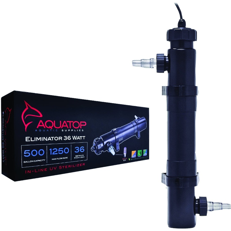 The AquaTop 18 Watt Eliminator Series In-Line UV Sterilizer maximizes UV exposure in a compact, easy-to-install unit. The 18 Watt Eliminator Series In-Line UV Sterilizer can be installed in-line or attached to the wall or cabinet. Simply connect to a water pump, power head, or on the return line of a canister filter with a maximum flow rate under 750 gph. Features: