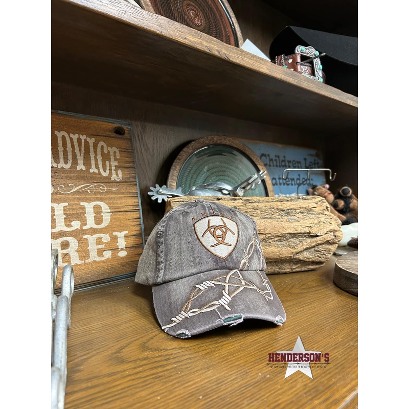 Go on your next great outdoor adventure with this ball cap. This handsome ball cap has a barbed wire look with contrasting distressed bill. The brown Ariat logo adds a nice over all look to this hat. The back is fitted with an adjustable Velcro strap.