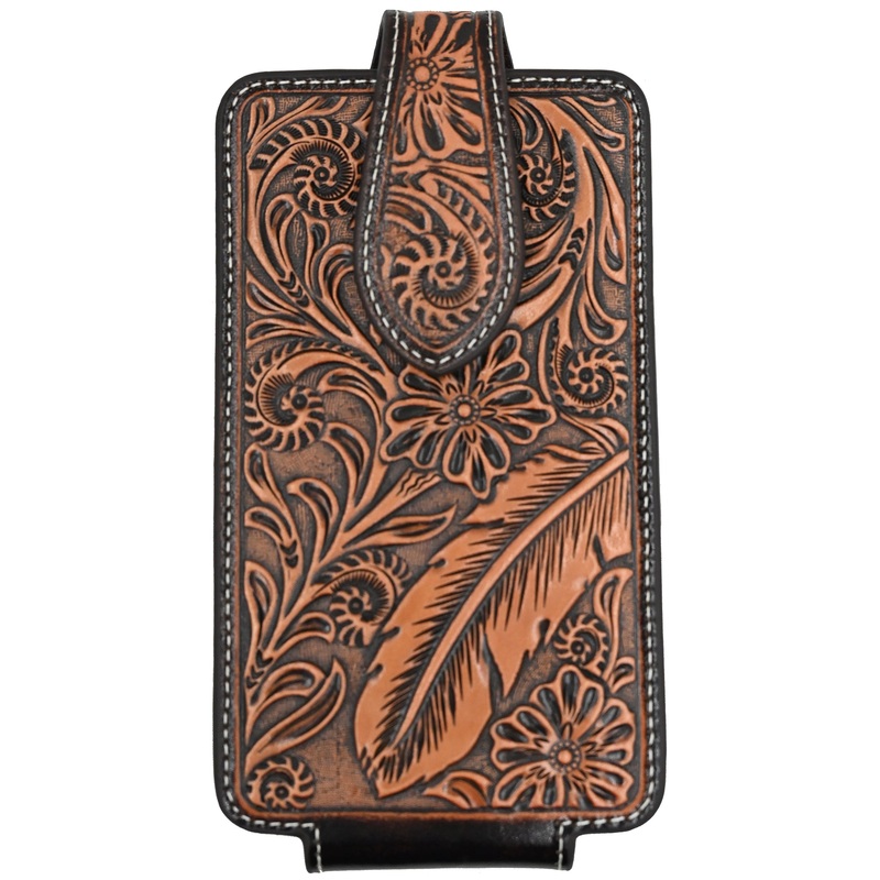 The Ariat Chocolate Cell Phone Holster with Natural Tooling is a beautifully crafted leather phone holster designed to securely hold and protect your cell phone while adding a touch of elegance. This holster combines durable leather construction with intricate detailing, making it both functional and visually appealing.