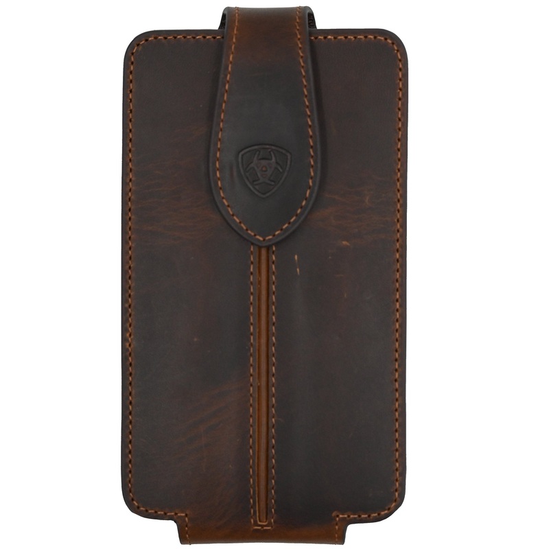 The Ariat Chocolate Cell Phone Holsteris a beautifully crafted leather phone holster designed to securely hold and protect your cell phone while adding a touch of elegance. This holster combines durable leather construction with intricate detailing, making