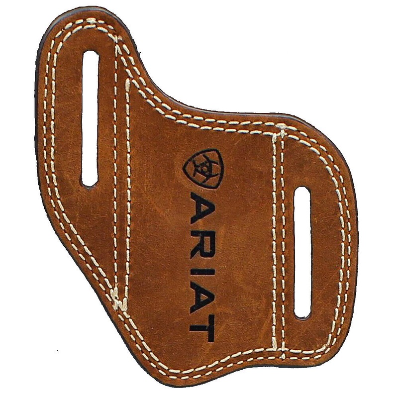 Ariat Leather Knife Sheath SleeveMedium BrownExterior Measurements: 3-5/8" x 3"Opening: 1-1/2" x 1/4"Soft Leather SheathBlack Embossed Ariat Signature LogoDouble Contrast Stitching2 Slits to Slide Belt Through For Secure FasteningFits Up to a 1-1/2" BeltCa