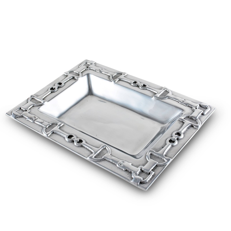 Combine your passion for horses with elegant hosting using the Equestrian Catch-All from Arthur Court. The striking design features bits arranged with impeccable symmetry around the edge, drawing attention to their intricate angles. Handcrafted from aluminum, this dish showcases exceptional craftsmanship and adds a touch of sophistication to any spread.