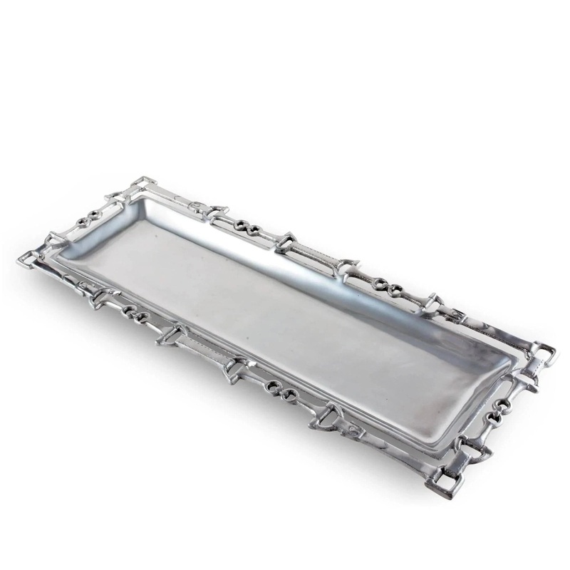 Celebrate the connection between horse and rider with the Arthur Court Equestrian Oblong Tray with Openwork. This unique tray reimagines traditional design by using bits to form the edges, with leather straps elegantly linking the mouthpieces around the lu