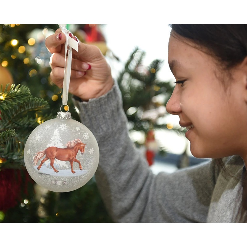 Almost every equestrian has had a special pony in their life, and this years Artist Signature Ornament celebrates them! This double-sided, flat frosted glass ornament features glittering snowflakes and two works of art inspired by Breyer models. Designed by artist Sheryl Leisure, one side features a joyful chestnut pony romping through the snow, and the other features a dun Chincoteague Pony mare and foal on a snow-kissed beach.