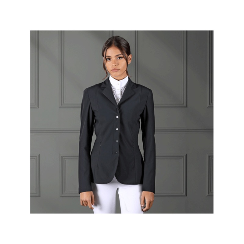 Elegant show jacket which has a slim, contour active cut and a minimalistic style and is made using a stretch material. Satin is piped around the jacket edge for definition, cuffs are zipped for an immaculate silhouette.