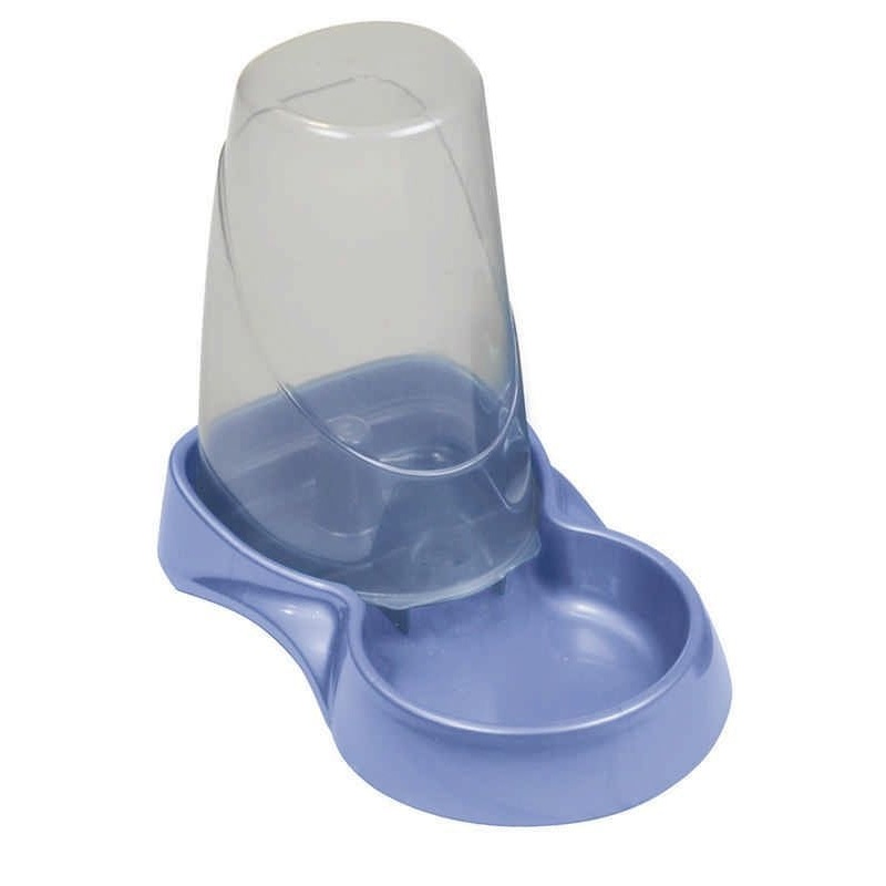 The Small Auto Waterer provides ample water supply for a cats and small dogs. It features a spill-less valve, a removable top for easy cleaning, and a clear, smoke finish for easy viewing. The handles allow for easy lifting and mobility. The Container Can Be Filled Thru Spill-Less Valve Or Remove top to Fill. Turn Container Over and Place On Base Dish and Allow Water to Flow Freely Into Dish. It is Easy to Clean Because top Can Be Removed and Is Dishwasher Safe. Dimensions: 9 1/2″ X 5 5/8″ X 7 1/4.” It has a 1.5 liter capacity. This unique product allows your cat or dog to receive fresh water as he/she drinks. Assorted colors, sorry no color choice.