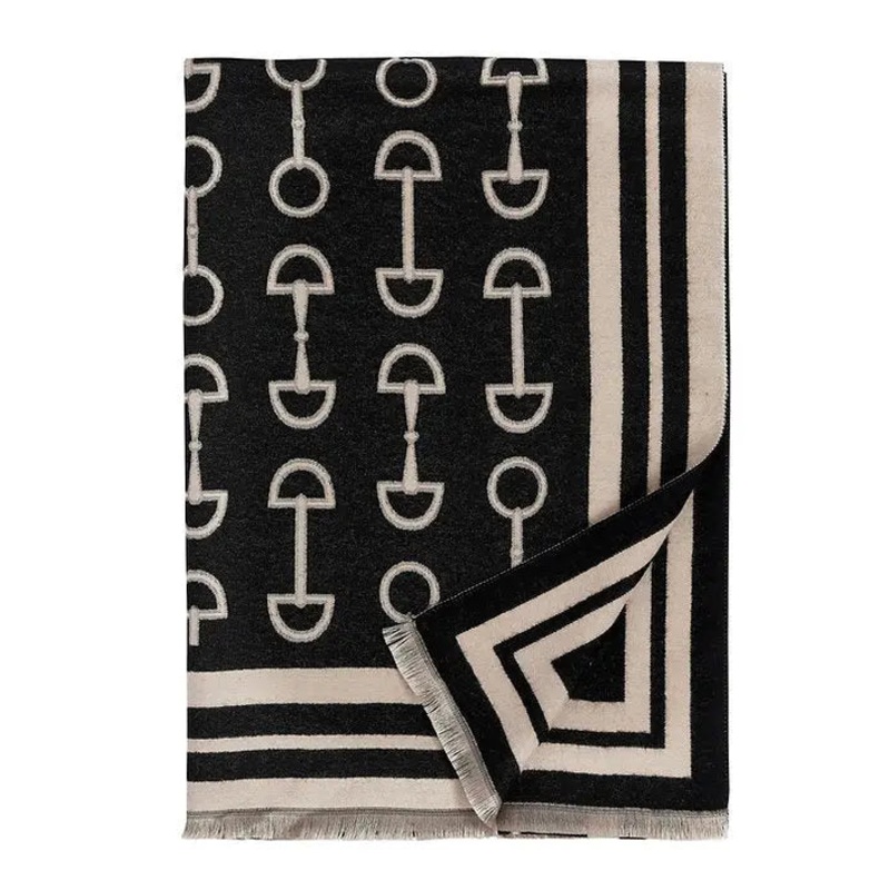 Reversible Snaffle Bit design, scarf/shawl. Acrylic cashmere, 75″ x 26.5″. This fabulously soft that says luxury