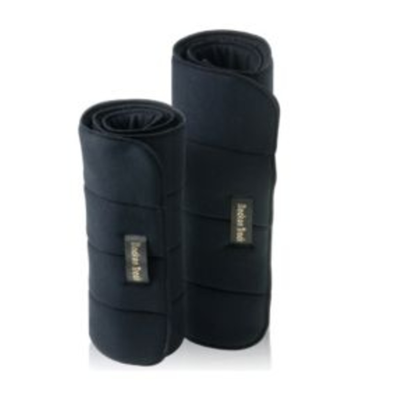Back on Track Therapeutic No Bow Leg Wraps Heat therapy is a well-recognized method used to help relieve and help heal injured muscles, joints, and tendons. No Bow Leg Wraps are a cotton/polyester blend material of state-of-the-art Welltex fabric, which reflects your horse’s natural body warmth and creates a soothing far infrared thermal heat. When you wrap your horse’s legs with these wraps, the unique fabric creates gentle heat, which may help decrease swelling and soften or completely reduce wind puffs without the use of liniment or poultice. Use with standing bandages after a strenuous ride and leave them on overnight. These leg wraps are ideal for injury recovery or prevention, and you can also use them when you ship your horse. Sold as a pair. Item Specifications: Sizes: 12″, 14″, 16″ Measure the length of the canon bone to determine the correct size. Color: Black Care: Machine washable up to 90F or 30C. Use normal detergents that do not contain bleach or fabric softeners. Air dry only, do not tumble dry. Instructions for Use Back on Track leg wraps should be introduced gradually. They should only be applied for a total period of 4 hours per day for the first 2-3 days. After that, it is recommended to keep them on overnight. Caution should be used during the first 2-3 days as excessive use from the outset may cause legs to “fill up” due to increased blood circulation. However, this is a good sign of efficacy. Please note that physical responses can be variable. Often you will notice a reduction of puffy or sore joints within a few hours or days. Occasionally however, you will need to persevere for 10 days to 30 days, particularly with established long-term injuries.
