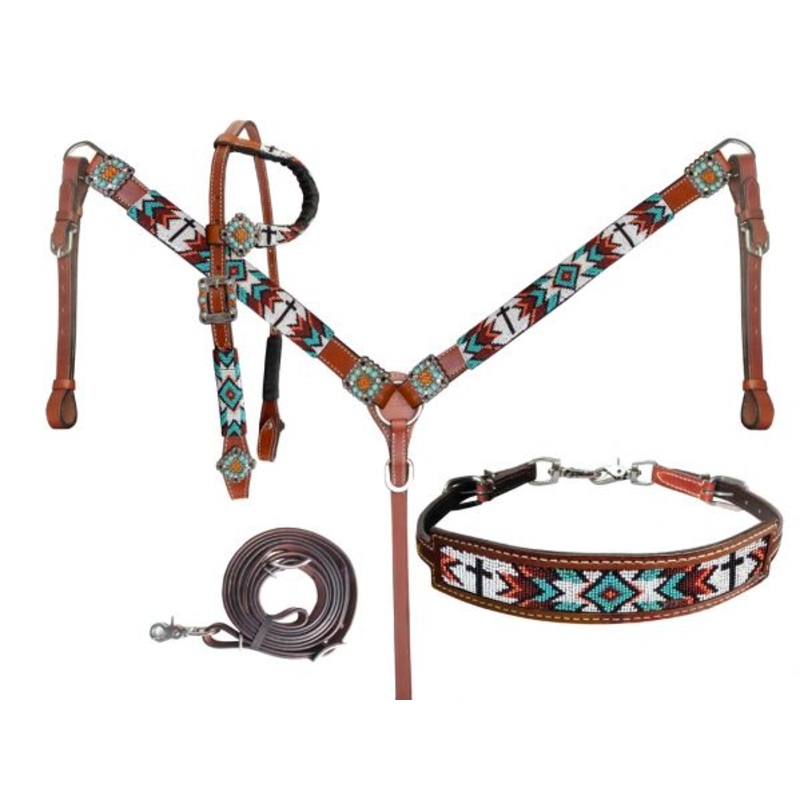 ShowmanBeaded Cross & Southwest Design 4 Piece Set. This set features medium leather with a with a Southwest beaded overlay with brown, turquoise, and white beads. Set is accented with silver conchos with orange & turquoise beads as well as on buckles. Set comes with single ear headstall, breastcollar, wither strap, and contest reins.