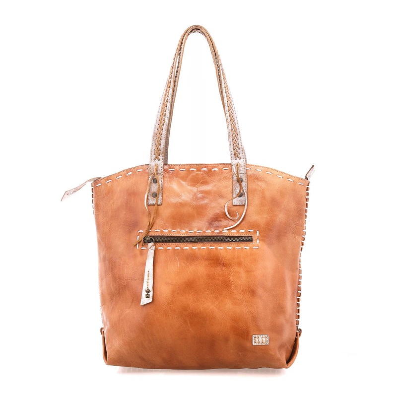 TAN RUSTIC NECTAR LUXBarra IIChrome and formaldehyde-free vegetable tanned leatherTote bag with zip-top closure, and outside zipper pocketUnique woven stitching detail around the edge of the bag and on the strapsInside zipper pocket and two slip pockets, o