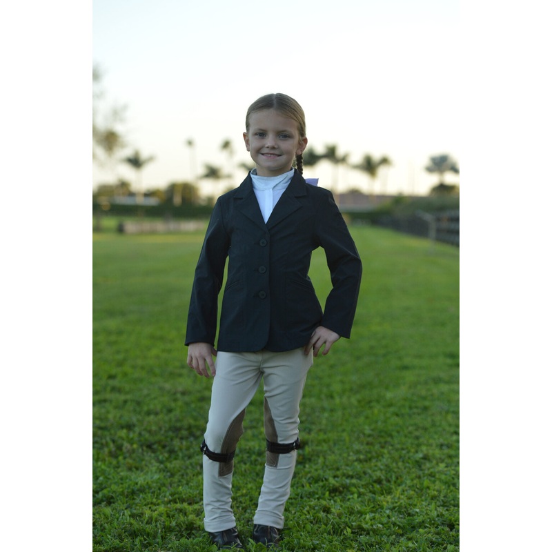 This Classic navy show coat is just what everyone has been asking for. Gorgeous Navy color with tone on tone embroidered accents. Finally a coat that is lightweight, stretchy, comfortable and fits the littles! Perfect for any show ring, leadline to Pony Hunters. Pairs perfectly with our show jodphurs and show shirt. Polyester and Spandex.