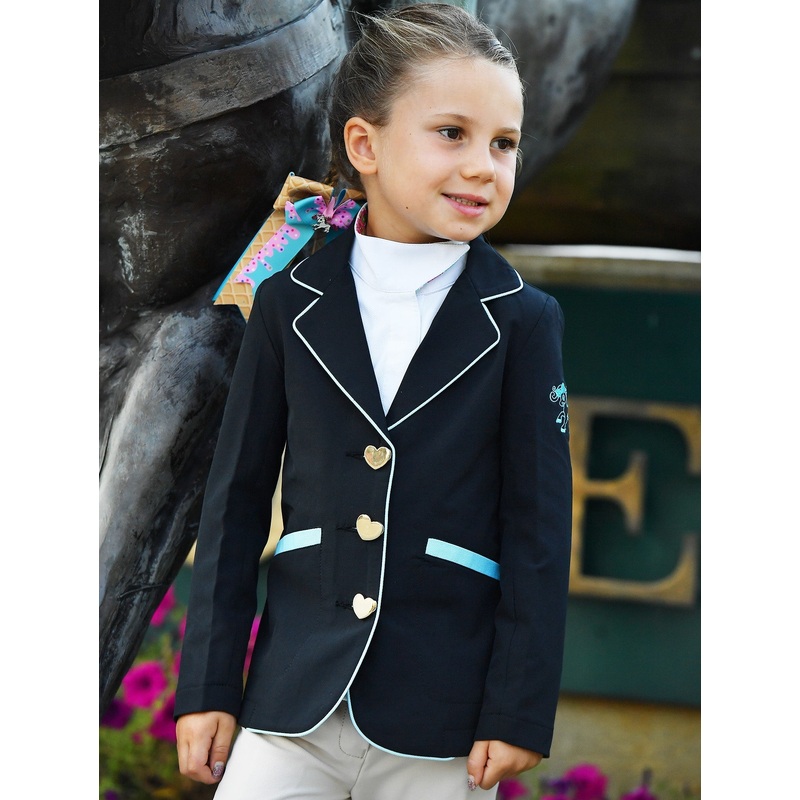 Our Sweetheart Show Coat is the sweetest! Gold tone heart shaped buttons, piping, pocket trim and our logo Belle pony embroidered on the sleeve.