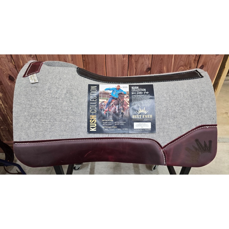 The Best Ever Kush Burgundy Oiled Saddle Pad is made with 100% quality washed and pressed wool. It features burgundy oiled cowboy leather and a lasered crown. Gooseneck contour. The pad is suitable for spring, summer, autumn, and winter. It measures 32"x32
