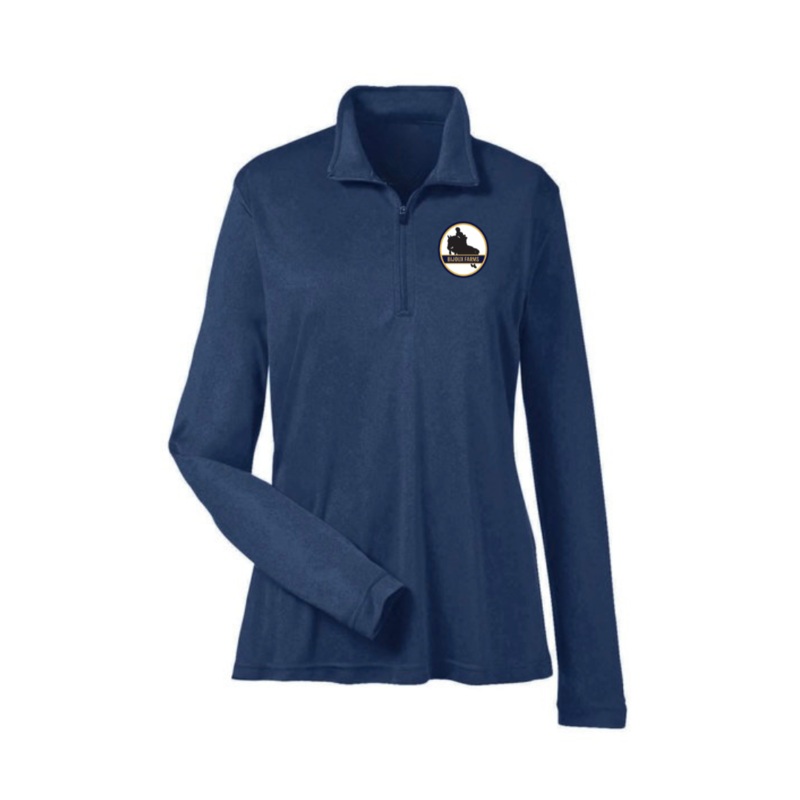 Made from light weight material, perfect for long horse show days!Features:100% polyesterMoisture-wickingUV protection performanceCenter front coil zipperAvailable in navy
