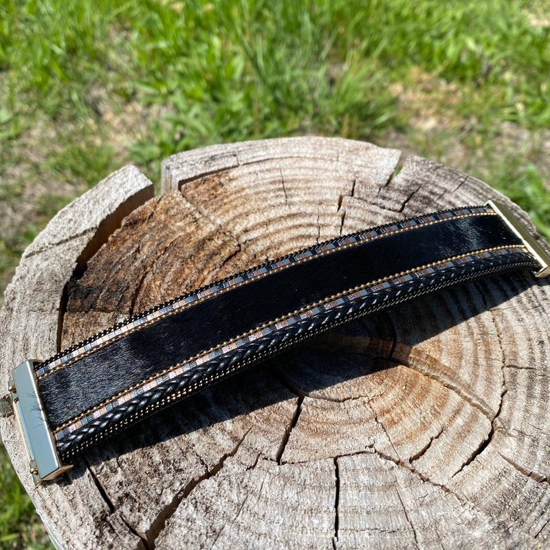 Bracelet is blackfabric, thatis decorated with black faux fur & leather braiding.Gold colormagnetic clasp.Bracelet measure 7.5" long and 1.25" wide.
