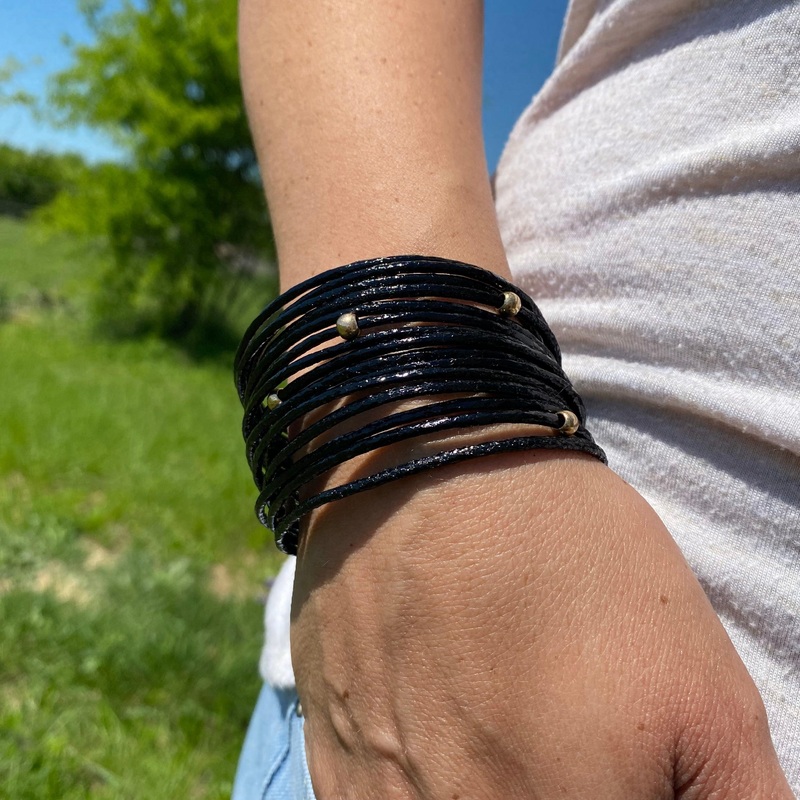 Braceletin black leather, multi strands. Gold colored beads and magnetic clasp.Bracelet measure 7.5" long and 1.25" wide.
