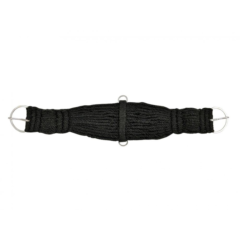 String girth with nickel plated flat hardware. Black strands are woven on both sides to help support the strands of the girth.