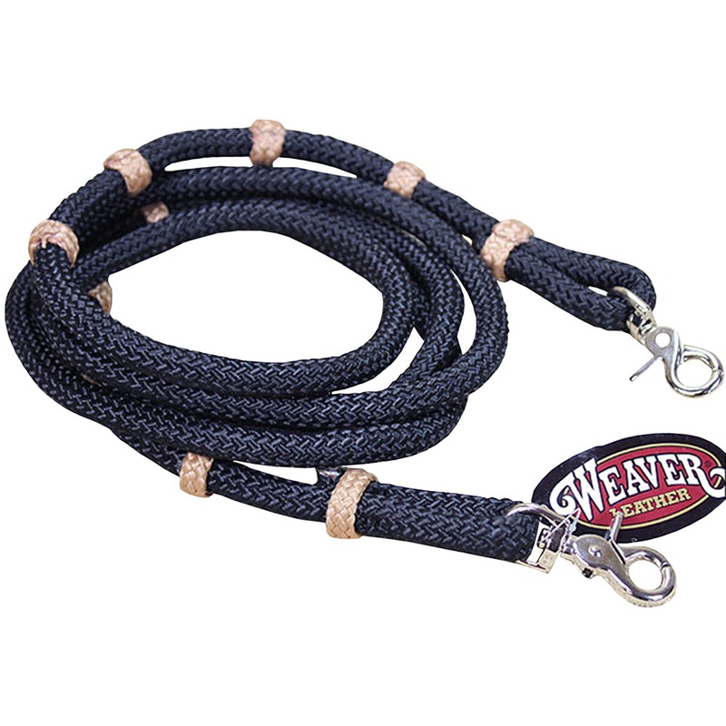 Product ID: WL-35-2025-BK -- This braided nylon rein features tan braided nylon overlays at the rein ends. Durable nickel plated scissor snaps. Measures 3/8 inches x 8ft.