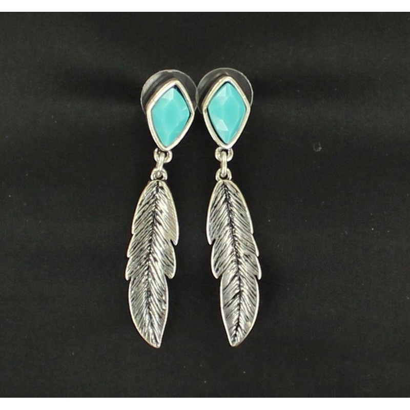 Blazin Roxx single feather silver tone post earrings with shaped turquoise stone.