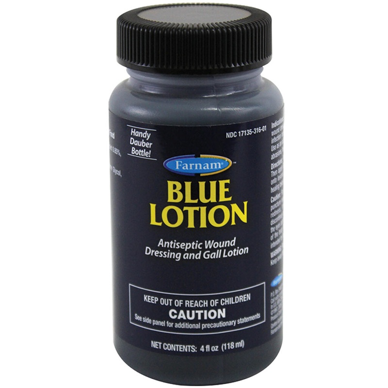 Wound dressing and antiseptic. Quick-drying, deep-penetrating antiseptic wound dressing and gall lotion. Effective against bacterial infection common in skin lesions of horses and dogs. Use as an aid in the treatment of surface wounds, minor cuts, skin abrasions, harness galls and saddle sores.