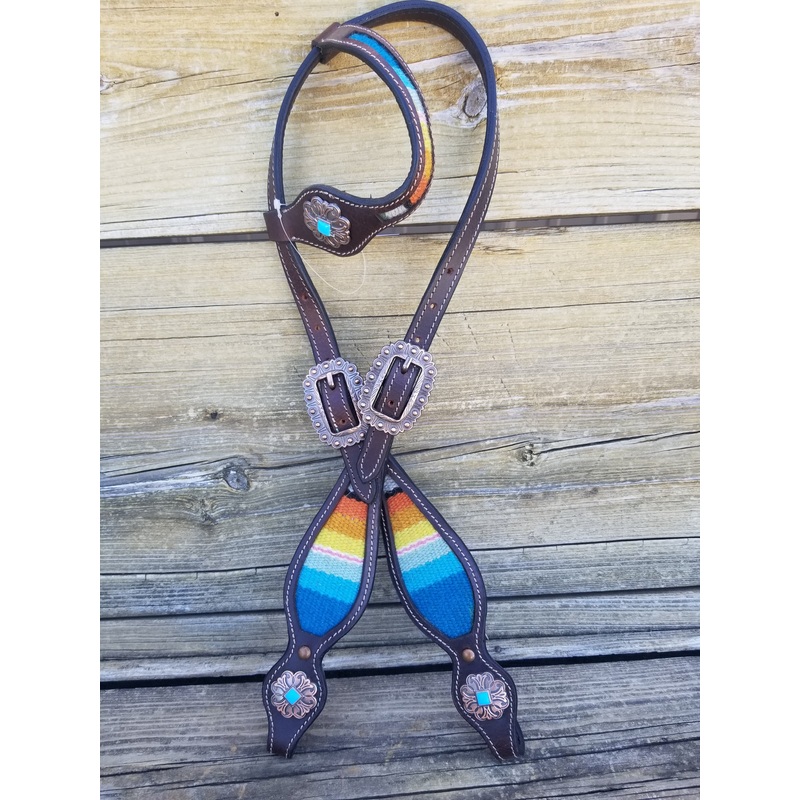 Blue, yellow and orange colored pendleton style wool inlay headstall with double buckles.