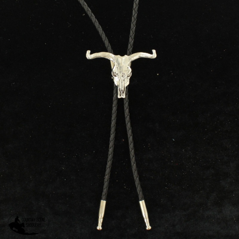 Double S Bolo TieAdult 36 Inches LongSilver Longhorn SkullBlack Bolo TieDescriptionStylish Double S bolo tie. Black bolo tie with a silver colored longhorn skull slide. This bolo tie will certainly get you noticed.(61325)