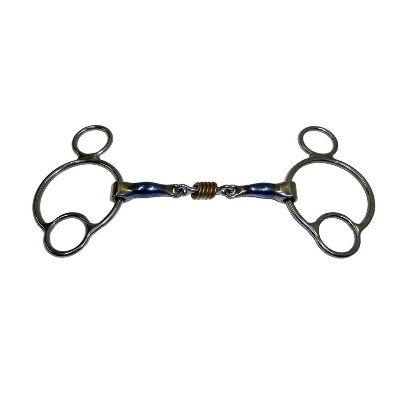 The blue sweet iron mouthpiece encourages salivation, softening and acceptance of the bit because it oxidises easily, creating a warm, sweet taste in the horse’s mouth. The double joint means the mouthpiece follows the contours of the horse’s mouth, which reduces the ‘nutcracker’ action associated with single jointed bits, and resultant bar and palate pressure.