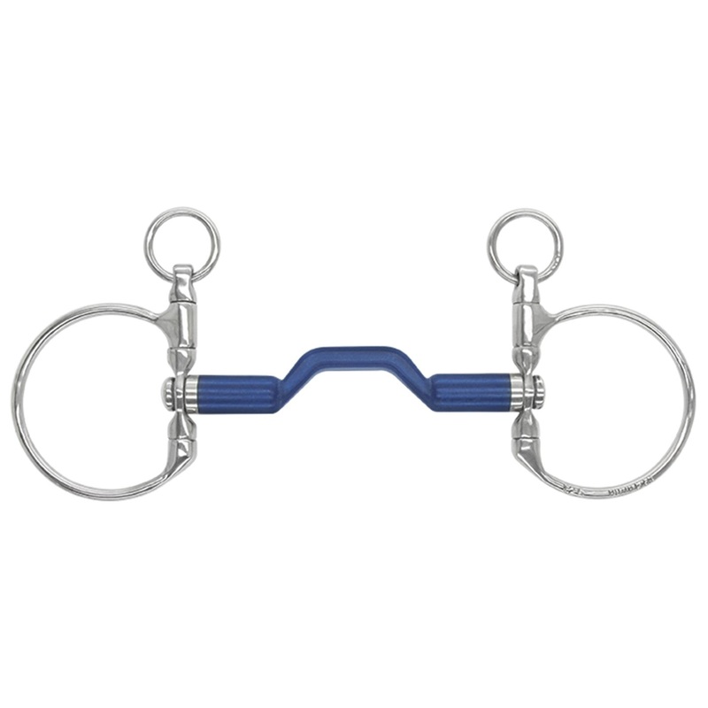 Great for horses that may object to metal mouthpieces! The Bomber Blue is a unique bit that helps horses perform at their best with a ported mouthpiece for tongue relief. The swivel mouthpiece can rotate on the horizontal, allowing the cheek piece to move independently so the horse can set the mouthpiece where it’s most comfortable. The reins attach to the large dee which swings independently of the cheek pieces ensuring the poll and cheek area is relieved from any rein engagement. The blue sweet iron mouthpiece oxidizes easily, warms up quickly, and tastes sweet in the horses mouth. Please note that the blue will fade and oxidize with use.