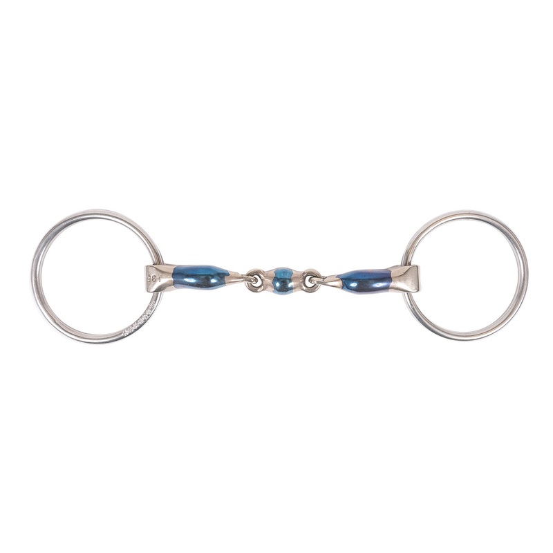 Created from blue sweet iron to help encourage salivation, the Bombers Loose Ring Elliptical Dressage Control Bit helps to prevent the horse from using its tongue to push against the bit. Featuring an ergonomically shaped mouthpiece and a flat lozenge joint to help provide softer tongue pressure. The double-jointed mouthpiece facilitates movement in the horses mouth to help encourage bit acceptance. The blue sweet iron oxidizes easily and offers a warm, sweet taste for your horse.