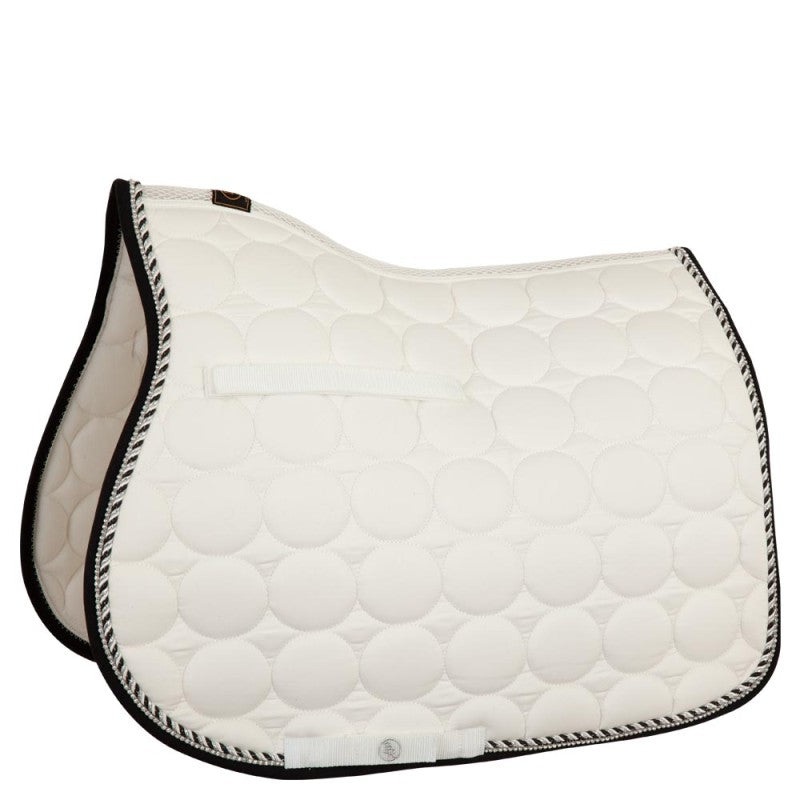 This subtle and elegant, preformed saddle pad made of polyester cotton has a polyester airflow filling and an airflow back seam to promote airflow. The saddle pad has a 300g polyfill and 10 mm foam filling and is finished with cord piping and decorative tape with imitation diamonds. Features a circle quilt design and girth loops and retaining straps with Velcro closures.