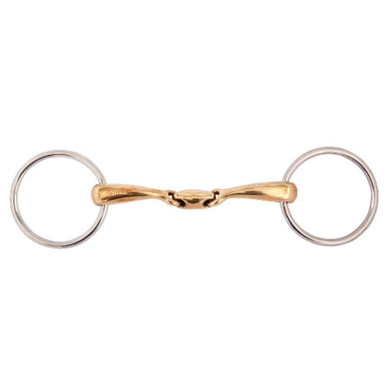 The Soft Contact bits are anatomically shaped. Besides, they have a luxurious look thanks to the golden mouthpieces and your horse might even like the taste of it! This double jointed loose ring snaffle is made of solid Cuprigan with stainless steel rings.