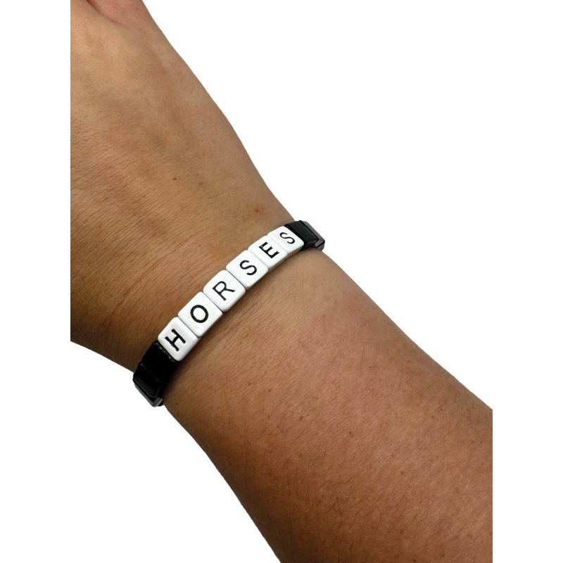 Our “Horses” Black and Gold Bracelet features textured Black and gold beads with the word “Horses”. Each bracelet is 7″ in length, 7MM bead diameter and is a slip-on-style. All of our single bracelets are designed to be stacked or they can be styled to wear alone.