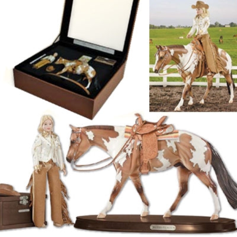 Breyer Elegance Western Set Horse, cowgirl with porcelain head, western show saddle and bridle. Also includes a tack box and wooden presentation base. All beautifully showcased in storage box.