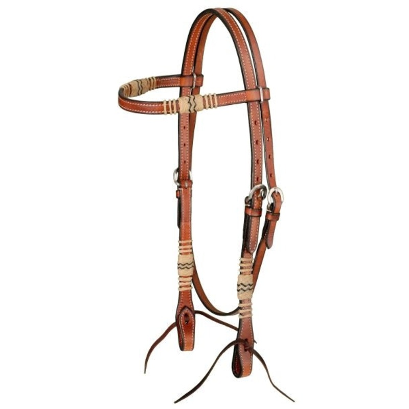 Premium cowhide browband headstall features natural rawhide design with black accents. Tie bit ends.